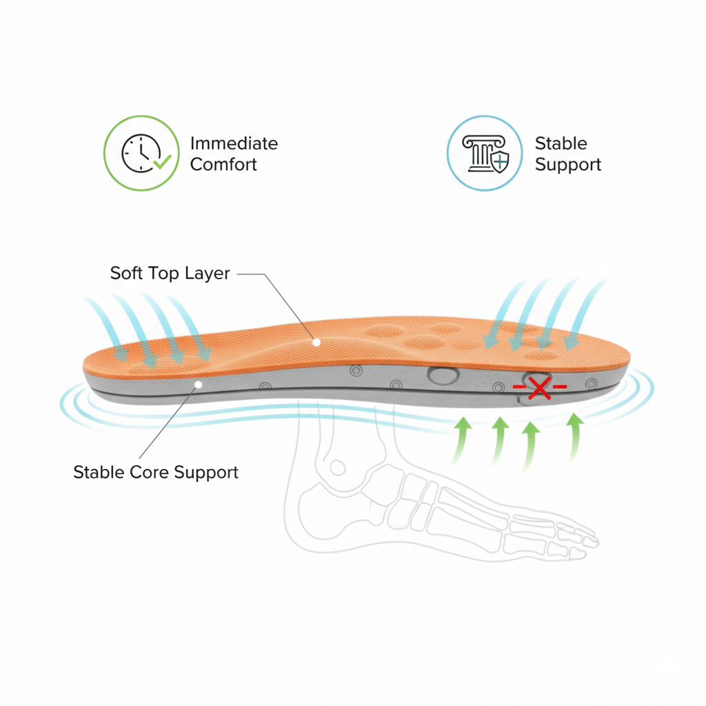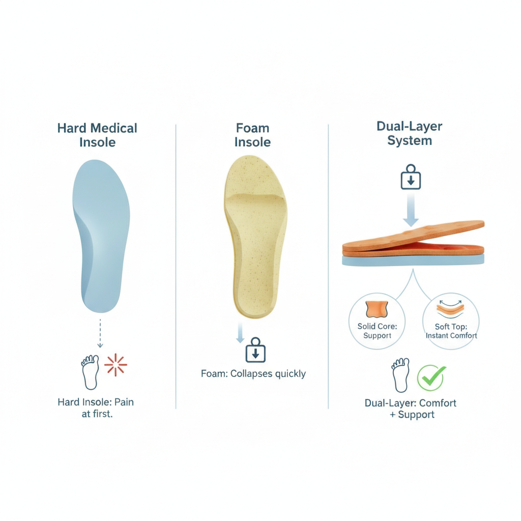 الإسفنج ناعم لكنه ينهار بسرعة. النعل الطبي صلب لكنه مزعج بالبداية. هذا النظام يجمع الاثنين: