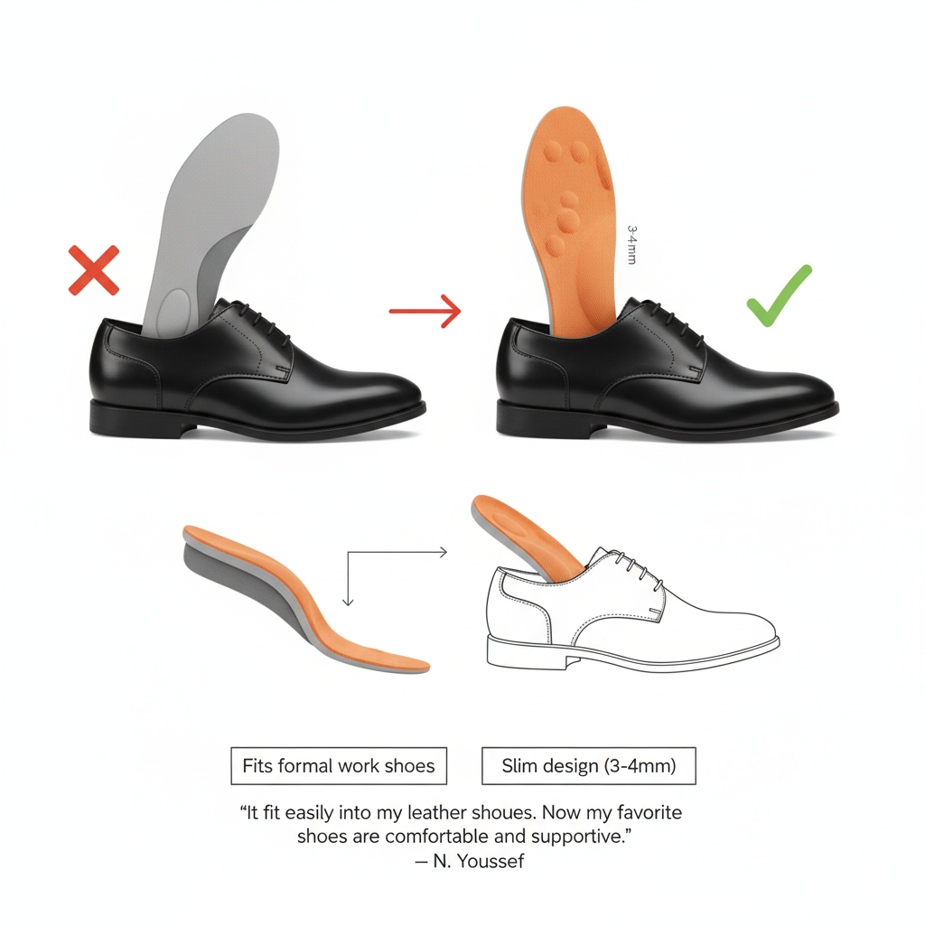كثير حلول الدعم “تقتل” شكل الحذاء… أو تخلي الحذاء يضيق. هذا النظام نحيف (حوالي 3–4 مم)، يدخل بسهولة في الحذاء الرسمي الجلدي بدون ما يخرب مظهرك.