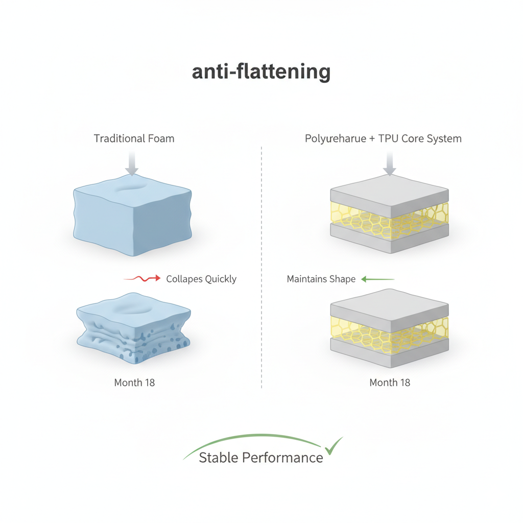 الإسفنج مجرد “وسادة” تتسطح بسرعة. هذا النظام فيه نواة ثابتة تحافظ على الدعم لفترة طويلة بأداء شبه ثابت.